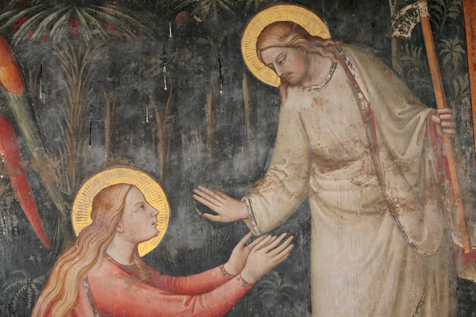 Ранним утром на третий день после Распятия святая Мария Магдалина, опередив других жен-мироносиц, пришла ко гробу с ароматами и увидела, что камень, закрывавший вход в гробовую пещеру, отвален (Ин. 20, 1; Мк. 16, 4). Тогда она в смятении возвратилась в Иерусалим и позвала апостолов Петра и Иоанна: «Унесли Господа из гроба и не знаем, где положили Его» (Ин. 20, 2). Апостолы Петр и Иоанн поспешили ко гробу и убедились, что он пуст: Тело Христово исчезло, пелены же, которыми оно было обвито, лежали отдельно от плата, покрывавшего Его главу. Пребывая в душевной растерянности, Петр и Иоанн вернулись в Иерусалим. Мария Магдалина осталась у гроба в безутешном горе, она не рассуждала о происшедшем, но мысли ее и сердце были со Христом. И когда она вновь заглянула во гроб, то увидела там двух Ангелов в белом одеянии, которые спросили ее: «Жена, что ты плачешь?» Страдание святой Марии было так велико, что она, не задумываясь, сказала о своей беде Ангелам то же, что сказала бы людям. Внезапно вид Ангелов стал особенно благоговейным; святая Мария Магдалина невольно обернулась назад и увидела Иисуса, но не узнала Его (Ин. 20, 14). Господь не сразу открыл Себя ей, дабы она привыкла к Его облику. После сострадательного обращения к ней Спасителя— «Жена, что плачешь? Кого ищешь?» — святая Мария, приняв Его за садовника, почувствовала надежду. Она обратилась с доверчивой просьбой к Явившемуся: «Господин, если ты вынес Его, скажи мне, где ты положил Его, и я возьму Его» (Ин. 20, 15). И этого было достаточно, чтобы Христос дал ей узнать Себя. Он назвал ее по имени, и она бросилась к Его ногам, воскликнув: «Учитель!». Господь кротко отстранился от нее, дабы просветлить ее помышления и помочь ей уразуметь, что Он воскрес в преображенной плоти: «Не прикасайся ко Мне, ибо Я еще не восшел к Отцу Моему» (Ин. 20, 17). Христос послал святую Марию с вестью от Него к ученикам, и блаженная жена, ликуя, возвестила Апостолам о виденном— «Христос воскрес!» Как первая благовестница Христова воскресения, святая Мария Магдалина признана Церковью равноапостольной. В этом благовестии главное событие ее жизни, начало ее апостольского служения.